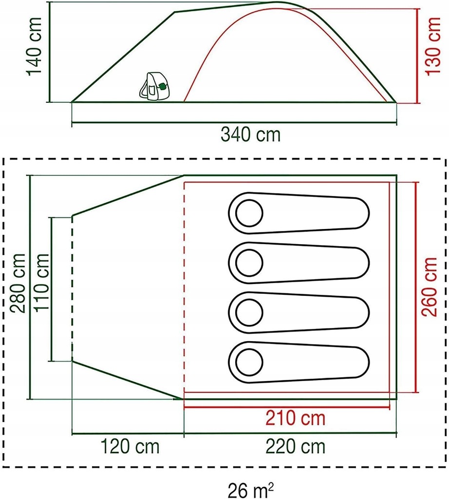Obszerny, 4-osobowy namiot typu iglo. Idealny na festiwal muzyczny, kemping i wyjazdy turystyczne. Ma dużą sypialnię, którą pokrywa materiał wyposażony w zaciemniającą technologię BlackOut. Warto także wspomnieć o praktycznym przedsionku, który wyposażono w zasłaniane okna oraz zintegrowaną podłogę.