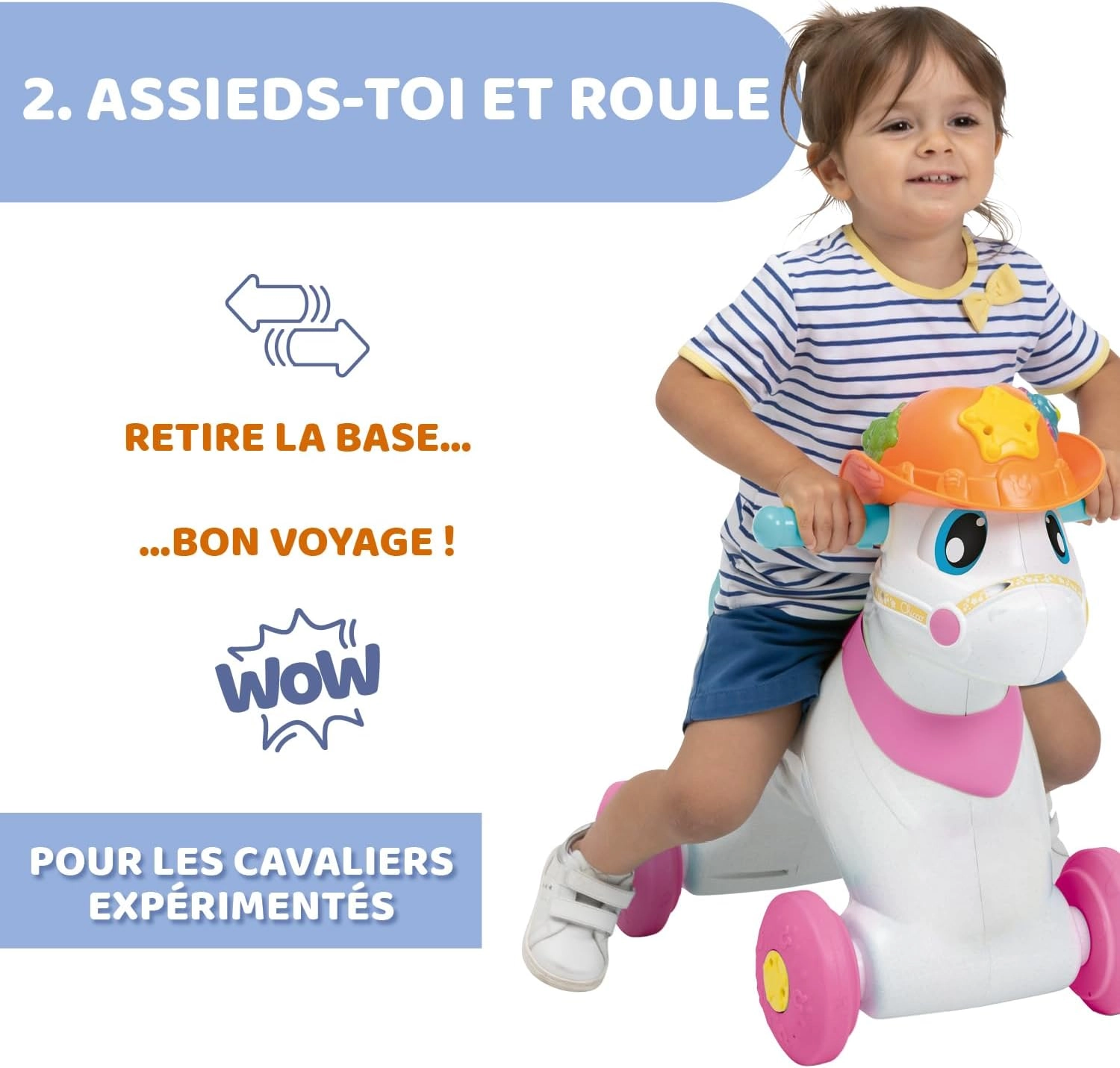 - Koń: podstawę można łatwo usunąć, aby przekształcić konia na biegunach Miss Baby Rodeo Chicco w niezależną sztalugę