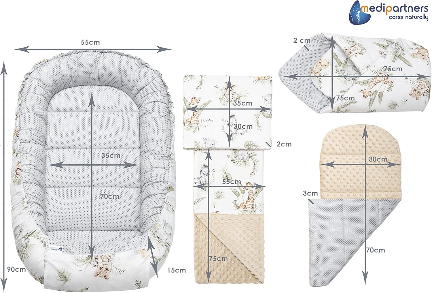 Medi Partners 5el. Kokon Niemowlęcy 100x60x15cm Wyjmowana Wkładka Kocyk Płaska Poduszka Rożek Łóżeczko 100% Bawełna (Safari)