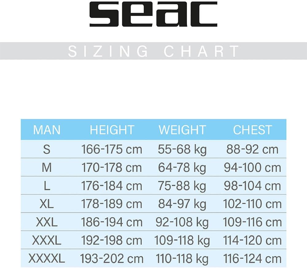 - Łatwy do założenia: kombinezon do nurkowania Seac Ciao jest dostępny w 7 rozmiarach od S do XXXXL ; tabela na zdjęciu pomaga określić właściwy rozmiar.