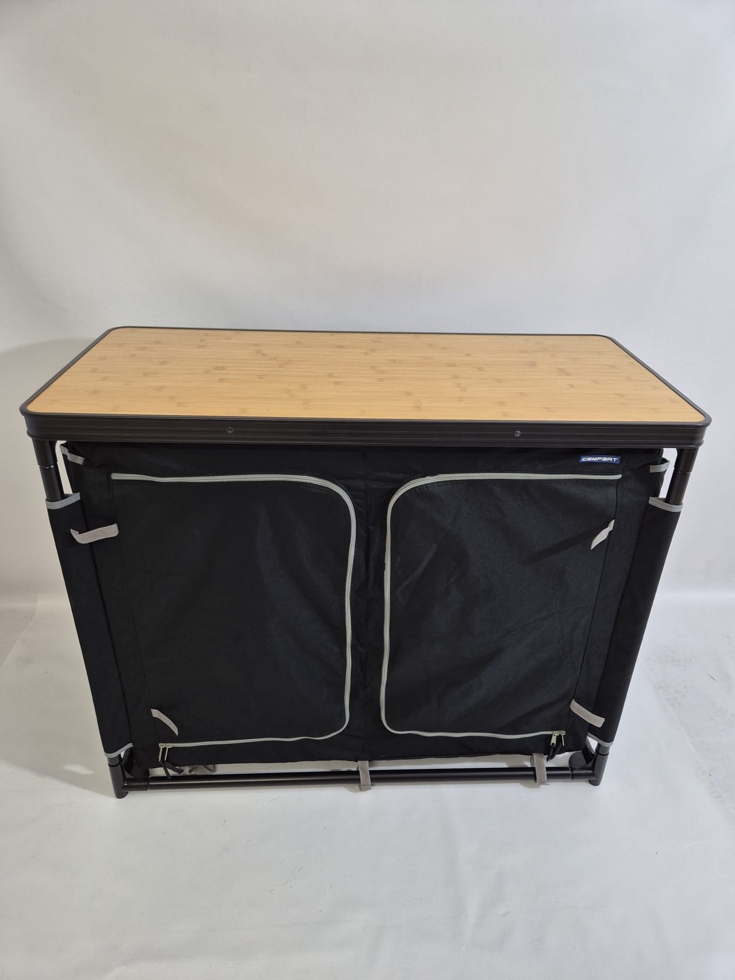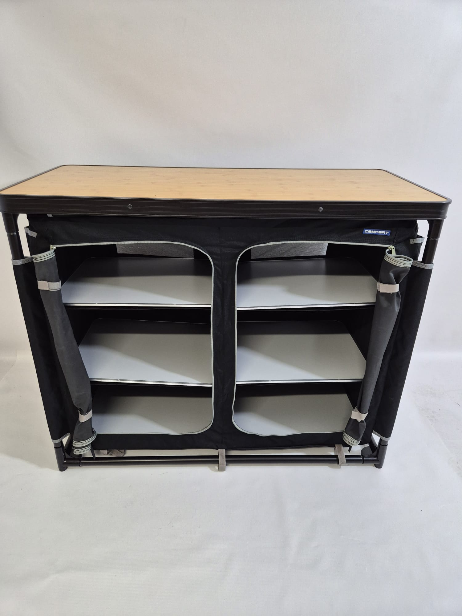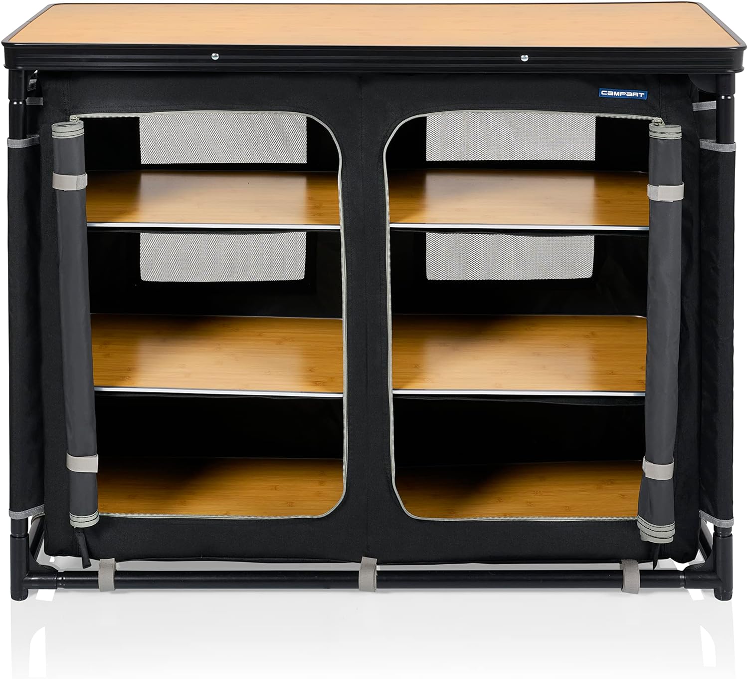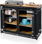 - Dzięki regałom i blacie roboczym z efektem drewna, kampingowa kuchnia Campart Zaragoza wnosi odrobinę elegancji, gdy wybierasz się na kemping. Górna część robocza może być używana jako podkładka pod kuchenkę lub zapewniać dodatkowe miejsce do przechowywania.