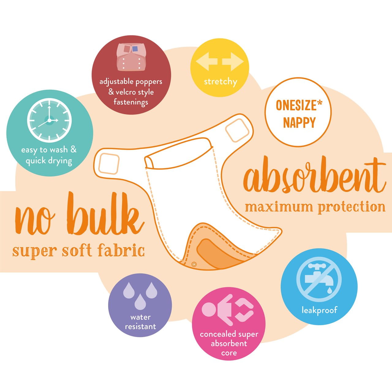 Dzięki napom z przodu pieluszki można idealnie dopasować rozmiar do dziecka. Zapięcia na rzep (które dzięki systemowi Velcro® są odporne na zniszczenia) umożliwiają dopasowanie rozmiaru w obwodzie dziecka. Super-chłonny wkład pieluszki oraz wewnętrzna warstwa „stay-dry“ pochłaniają wilgoć do pieluszki, chroniąc przed bezpośrednią stycznością wilgoci ze skórą maluszka.
